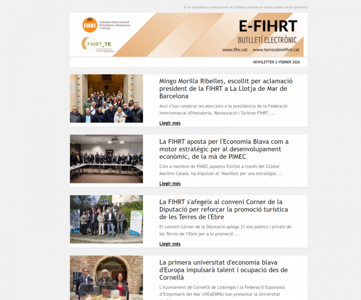 La Federació Intercomarcal d’Hostaleria, Restauració i Turisme (FIHRT) centra una part rellevant del contingut del darrer newsletter sectorial, en què es posa de manifest el seu paper actiu i influent dins l’ecosistema turístic i hostaler de Catalunya. El butlletí recull diverses actuacions que consoliden la federació com a interlocutor clau en matèria de governança, desenvolupament territorial i competitivitat empresarial.