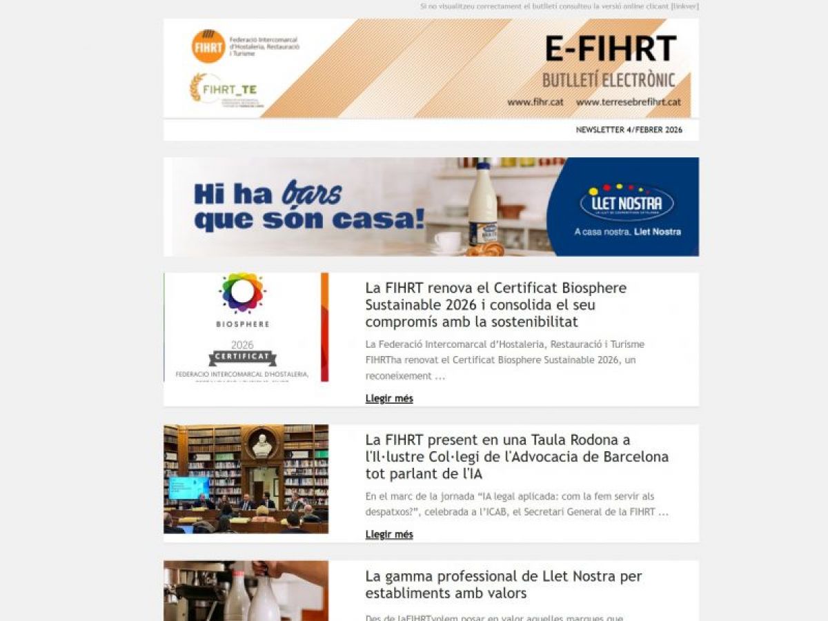L'E-FIHRT 4/FEBRER 2026 d'aquesta setmana ofereix una visió estructurada de l’activitat institucional, gremial i territorial del sector de l’hostaleria, la restauració i el turisme, amb tres eixos principals: sostenibilitat, professionalització i projecció.